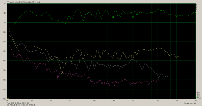 Harmonic distortion components are well under control with the correct ordering of predominantly lower order components and progressively less higher-order. It’s clear the aluminum shorting rings in the woofers are doing their job throughout the range, and the crossover is well-implemented for superior power handling. This relates well to the speaker’s ability to render a clean and resolving reproduction during dynamic passages.