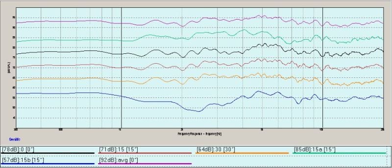 Next, the listening window response was measured. This evaluates the frequency response at +/- 30 degrees horizontally off axis, +/- 15 degrees off-axis horizontally and vertically, as well as the on-axis frequency response.
