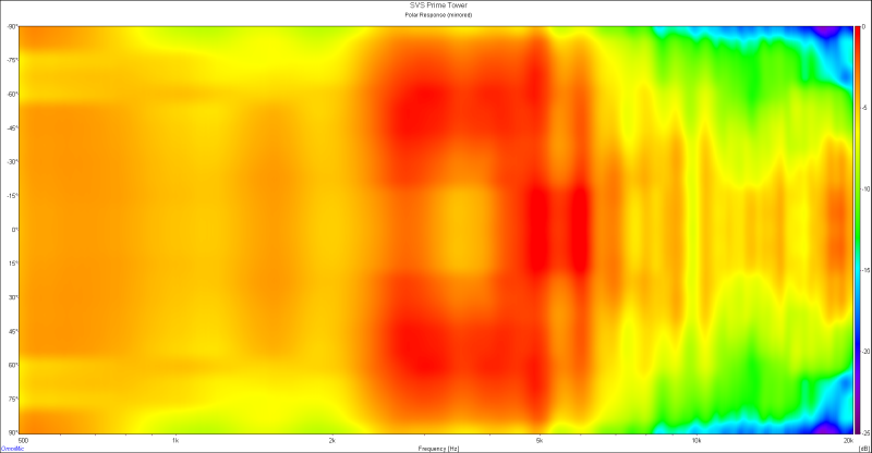 The polar contour map is an examination of off-axis frequency response at various angles 7.5 degrees apart. Since most rooms provide reverberant sound, it is preferable for late-arriving reflections to resemble the direct response. The Prime Tower shows good off-axis linearity, however the slightly elevated tweeter voicing is evident as the large red zone.