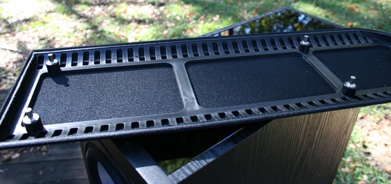 The top of the speaker has a piece of glass that is supposedly black. It may be tinted black but it is not opaque. This is obviously an attempt at a cheaper "gloss black" finish. Generally it works. In most light, at most angles, you can't see through the glass. However, at times you can. The grill is flush at the top and meets up seamlessly with a raised lip at the bottom. Personally, I think they look better with the grill off (I love me some aluminum drivers). The grill is integrated well into the design and looks good on.