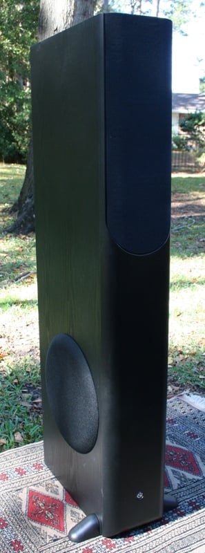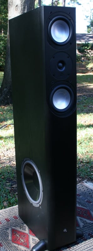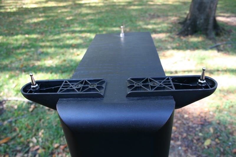 As I said, the speakers are heavy, much heavier than I expected for the price point. At 50+ pounds, they are a bit of a bear to move around. They are rear ported near the bottom, have dual binding posts for bi-amping, and are vinyl wrapped in wood grain black except for the front which has a sort of plastic finish. The front of the speaker sports an MTM driver configuration with two 5.25" aluminum drivers and a 1" closed-cell foamed polypropylene HiCell dome tweeter. There is a 10" side firing paper coated woofer. There is a single pair of plastic outriggers for the front of the speakers which need to be installed manually with two screws each. The back has a single threaded insert for a jester hat style carpet spike. The spike attachment points on the outriggers are slightly recessed so that it matches up with the rear insert. There are little rubber gloves (for lack of a better term) to cover the jester hats presumably for placement on hardwood or tile floors. I have carpet so that is not an issue.