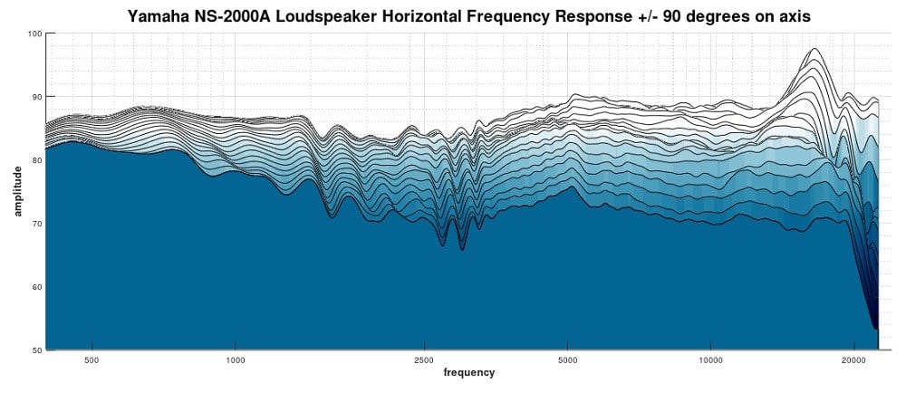 The above graphs depict the Yamaha NS-2000A’s direct-axis and horizontal dispersion out to a 90-degree angle in five-degree increments. Information on how to interpret these graphs can be read in this article: Understanding Loudspeaker Review Measurements Part II.