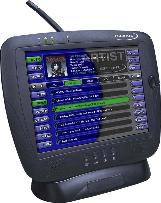Also announced are software upgrades for existing FireBall E-40 and E-120 and the EWP-1000 FireBall wireless tablet control. The tablet has an 8.4" color LCD touch screen designed for control of the full line of Escient FireBall products. It comes standard with built in cradle for recharging the battery and a USB port for connection to a PC. The software upgrade will enable the older models to have virtually all of the same funtionality as the E2-300, including the web server and PC compatible file sharing services.