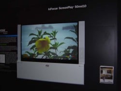 Gary Effert who represents InFocus was kind enough to spend some time with me and go over some of their new products at the show. Their big news was their comprehensive portfolio of large-format, consumer displays including a debut of the first two models of high-definition 6.8" ultra-thin microdisplay televisions - the 61" InFocus ScreenPlay 61md10 and 50" InFocus ScreenPlay 50md10. Yes, you heard that correctly - these DLP televisions are just under 7" thin!