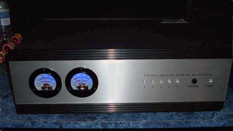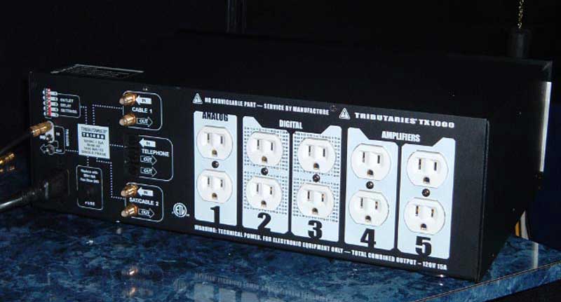 Tributaries is launching two new products: the TX-500 and the TX-1000. They're power conditioners, power controllers and surge protectors. They handle power conditioning, power controlling and surge protection, so Tributaries is dubbing them "power Managers". The units are UL-certified, which ensures that the TX500 and TX1000 are safe to operate and in compliance with the National Electrical Code. The balanced technology utilized in the units is designed to reject noise coming down the line. So anything riding on the AC line, from home appliances is automatically removed because of the way the filter works. It looks at both sides of the AC line and whatever's common is automatically removed. So it's only seeing the pure sine waves.