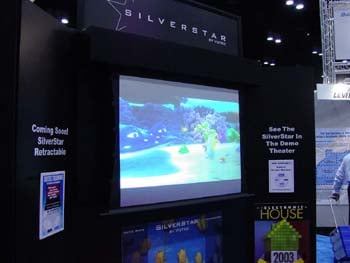 > Vutec is located in Pompano Beach, Florida, just a hop, skip and water ski away from Orlando. During the EHX, Vutec announced their new retractable version SilverStar Projector Screen. This high gain screen boasts and increased brightness by 6 which the manufacturer tells us provides more vivid colors, detail and high contrasts when compared to matte white or enhanced gray projector screens. In addition to the picture and demo shown to the right, Vutec also have a darkened room with a partitioned three part screen. A continual demonstration was projected on the three part screen using a Theater Automation WOW projector. The partitioned screen included a matte white, and an enhanced gray with the new SilverStar nestled in between. Unfortunately, the room was too dark for pictures, but we definitely so a difference between the three screen types. Like everything in life, there are trade offs for each item that is improved upon. It's the basic laws of physics at work. In this case, the enhanced gray screen seemed to show darker blacks, while the matte white had brighter whites. The SilverStar seemed to combine the best of both worlds while offering perhaps a bit less blackness than the gray screen and a bit less whiteness than the white screen, but definite improvement with vivid colors and details. We look forward to reviewing these screens in our next