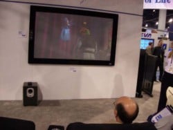 One of the cooler new items at CES this year was home theater screen manufacturer Da-Lite's first speaker and screen package. The Acoustical Imager is a projection screen that marries a fixed frame screen with 5.1 surround sound. JBL supplied Da-Lite with the firepower for this line with a system capable of reproducing 88dB through the included five speakers. Several speaker options are available such as 6.1 and 7.1 upgrades as well as your choice of wall or table mount satellite surrounds.
