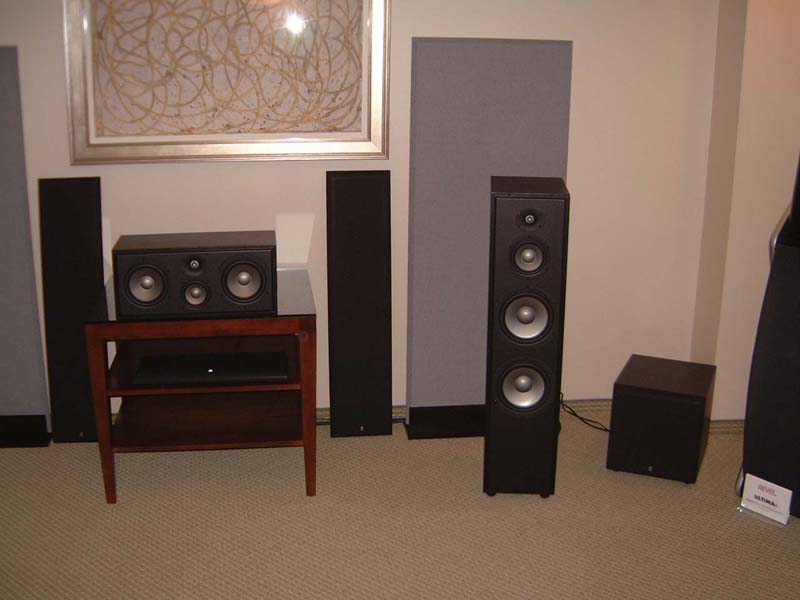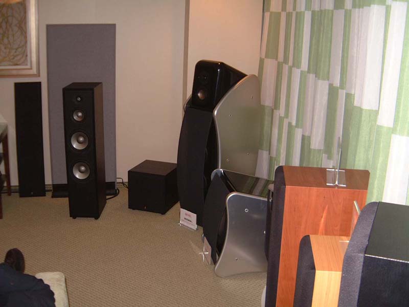 Talking about speaker designers who understand room acoustics, take a look of the four shots of the Lexicon/Revel suite. In the first shot the Lexicon electronics sit atop a wooden cabinet to the left of the left-center-right speakers. Note that the wood cabinet's front face is completely blocked by two ~20"W x ~4.5'H x 1"-2"D absorptive panels. That takes care of first order reflections from the left-front speaker. (Note also the odd size of these panels. This indicates that Revel had the room checked out a head of time and figured the exact size panels they needed for their demo, which would allow the Lexicon electronics to be mounted atop the cabinet. This layout was planned and cleverly so.)
