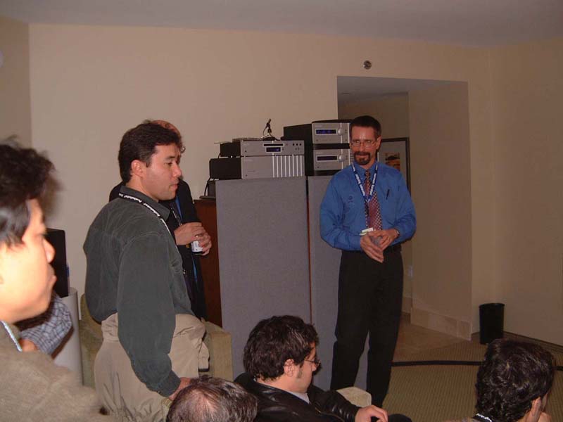 It was time for the demonstration of the V4 EQ room equalization module available as a retrofit for Lexicon's MC12 prepro at $2995. Jeremy started out "As you can see this room is not exactly ideal for listening. We'll start out with Logic 7 two-channel music (from CD) ." He then proceeded to play " Fever " by a male vocalist. After playing the sparsely orchestrated cut which featured slow finger snapping, a string bass and the male vocal Jeremy explained a bit more a bout Lexicon's purist approach to room correction." The V4 EQ uses seven bands of equalization which cover the frequency range from 19Hz to 250Hz. Above that frequency we recommend the more traditional approach to room correction which usually involves proper placement of absorptive panels such as you see around the room. We have four settings 'low, medium, hi and max'. We're using the medium setting which seems to be the best compromise in this room."