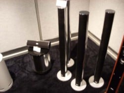 Danish speaker manufacturer Scansonic threw their hat into the CES ring today unveiling their sleek and streamlined Pipeline series speakers. At approximately 3.5 ' tall these jet black and silver speakers are definitely marketed for the consumer who seeks design aesthetics along with their home theater. While the fronts are identical to the surrounds and are meant to sit on their built-in base, the center speaker can be wall mounted or set into your furniture. While not packaged with the 5 speaker setup, Scansonic has also debuted it's Pipeline active 8" powered subwoofer, which with it's stout and shiny "oil can" appearance, it serves as the perfect compliment to complete the 5.1 array.