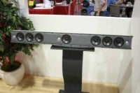 The SurroundBar is composed of a single 43" wide extruded Aluminum enclosure housing seven mid-range drivers and three dome tweeters. The product may be wall mounted above or below the TV with the supplied bracket. It may also be used on a shelf or on top of a TV with its supplied cradle. Both the cradle and wall bracket allow the speaker to be aimed up or down. The product is available in either Titanium or Black anodized finish.