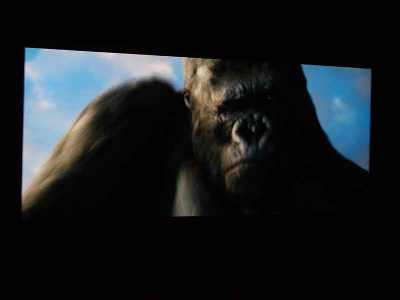 JVC had two systems configured - and there was no audio system to distract from the viewing. The "Mac Daddy" system included a Schneider anamorphic lens which took the native 16:9 anamorphic 2.35:1 edition of King Kong and stretched it to fit the full cinematic screen. The effect was a tremendously crystal clear picture that looked absolutely amazing. A $3000 Silicon Optix video processor made sure that the scaling was pixel perfect.
