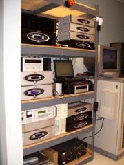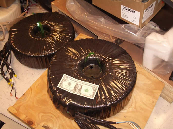 APC knows about all things related to power. To the left we have the largest toroidal transformers I've ever seen. These can satisfy any power freak who dreams of an amplifier powered by a nuclear reactor that can deliver its specified power into all channels driven continuously. On the right are the leftovers from a massive power test - they were interested in testing their high power InfraStrucure equipment. After connecting these transformer and inductors to a 300kVA power feed, they promptly shorted the outputs to ground. In doing so, they overloaded the utility's transformer - instead of giving up, they rented a 1 MW (1 Million Watt) generator to continue testing.