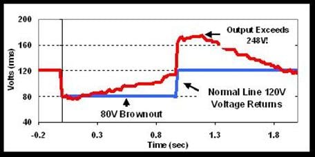 The red line is the output of the 'Voltage Regulator' - it took a full second to respond to the voltage event. By the time the 'Voltage Regulator' responded, the damage had already been done - the DVR shut down, the amplifiers shut off, the DLP bulb was thermally shocked, etc. However, the real damage occurs when the utility returns to normal - the motorized VARIAC continues to 'correct' the voltage supplying a peak of over 248V to your sensitive & expensive equipment. The 'Voltage Regulator' was a little faster reducing the voltage, but it still supplied dangerous voltage levels for nearly ¾ of a second. An amplifier's capacitors and power supply would have been toast.