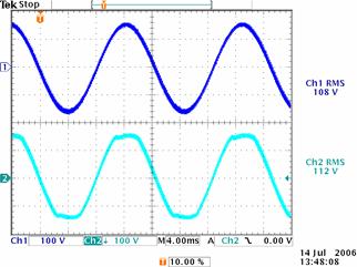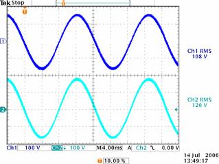 VARIAC is unloaded. Ch1: Input Voltage Ch2: Output Voltage |