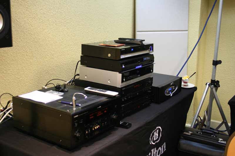 There was plenty of interest in this room, marrying Yamaha's groundbreaking new 11.2 receiver, the RX-Z11, with the impressive RBH Signature Series of speakers debuting their new T2-SER flagship towers. And wow! Within minutes of setting up the room and getting going, the hotel received noise (read: bass) complaints from people TWO FLOORS above the demo room! I quite enjoyed the fact that the Hilton told these people to "deal with it." In addition to the impressive sonic experience to be had in this room, Epson was showing off a package including their Pro Cinema 1080 UB projector paired with an 2.35:1 anamorphic lens kit and Silicon Optix HQV video processor. The processor allowed the Epson to utilize every single pixel on its LCD panels, providing an image that was 30% brighter and noticeably clearer. This amazing package (projector/lens kit/processor) will retail for less than $15k and should be announced soon. The result was a 2:35:1 widescreen display that was nothing short of stunning. My jaw dropped when I saw the clip from King Kong - the video quality was among the best I have ever seen. Carada's 2.35:1 Criterion screen made the experience complete. This room was showcasing approximately $55,000 worth of equipment! There were more source devices in this room than in all the other rooms combined. From looking at the stack of players it was apparent that somebody needs to make a Blu-ray or HD DVD changer - and quick.
