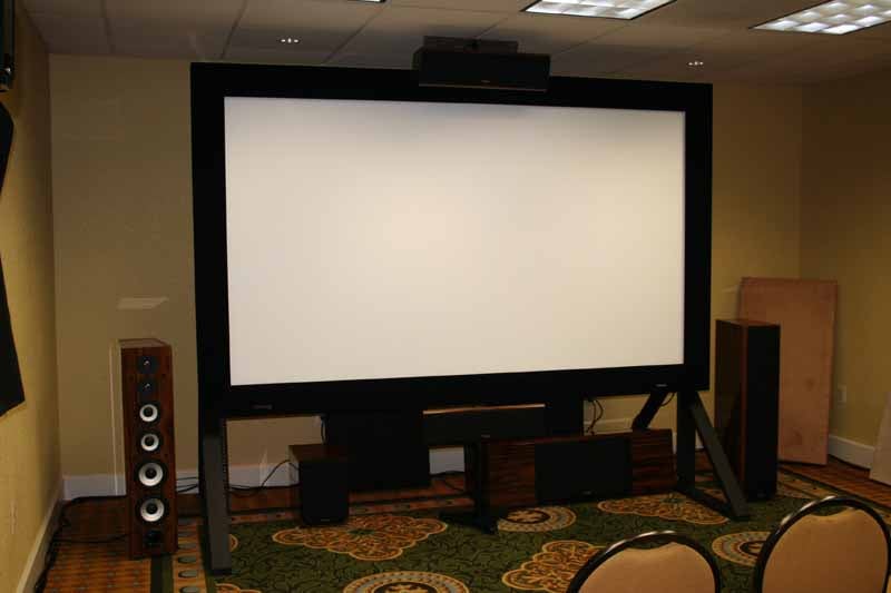 All day Friday, the manufacturers scurried to get their demo rooms and exhibits all setup. I never gave it much thought to the amount of effort these folks put forth during tradeshows like CES or CEDIA since I usually arrive once the shows have already began and all the equipment has been setup. These guys and gals were sweating bullets. David Giles from Carada was working to build false walls for screen systems in 3 separate demo rooms. Epson was working hard to calibrate their projector systems for the Axiom, Emotiva and Yamaha/RBH Sound rooms while Impact Acoustics was also providing cabling ensuring snake oil free connections. The Impact Acoustics RapidRun cabling system was a particular hit among all of our exhibitors due to its endless flexibility, performance and convenience. Axiom Audio was packing a roughly 400 sq foot demo room with over 20 speakers and subwoofers from their giant RV they drove all the way down from Canada. Now that’s commitment! RBH Sound, well, they couldn’t find their speakers till nearly lunch time and once found, had to figure out how to mount and wire up 11 speakers and two subwoofers to a Yamaha flagship receiver they’ve never seen before. Luckily some folks from Yamaha were at our event to lend a hand. This room had a very special video system featuring a brand new Epson Pro Cinema 1080 UB projector with anamorphic lens system that costs more than the projector itself. The new "UB" designation on the under-$5000 1080p Epson Professional Series projector stood for "Ultra Black" and the picture certainly lived up to the name. Kevin Miller from ISFTV was on hand to calibrate all of the Epson systems prior to the show and the results were amazing. The Carada Criterion screen was configured to accommodate a 2:35:1 aspect ratio to highlight feature films and the anamorphic lens option applied to the Pro Cinema projector. The room was treated by Auralex who used select Sonosuede panels to provide the necessary treatment to make the room acoustics more palatable while still aesthetically blending well in the room.