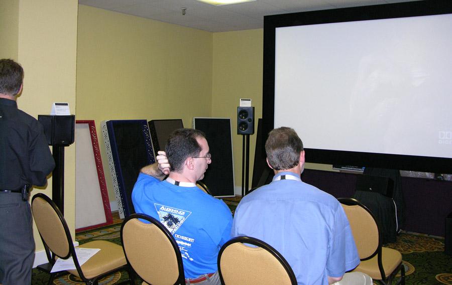 The Dolby/AIX room was a bit different from the other 3 demos in that they were showcasing technologies and source material rather than specific gear. This demo was in a larger room than the others (roughly 2000 sq ft), and had more seating. There was a large plasma display, speakers and Auralex panels surrounding the seating area. Before Auralex applied the room treatment to this room, it was very echoey. Upon first glance, I had no idea how they were going to pull it off. After all was said and done, the listening space turned out better than I expected. The result was an amazing sonic experience. I quite enjoyed hearing the entirely music-based demo which ran for nearly 30 minute sessions. The B&W speakers made a valiant effort at filling the large listening space though I couldn't help to wonder what that room would have sounded like with more dynamically capable speakers and subwoofers.