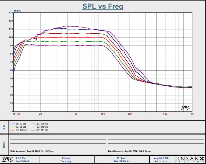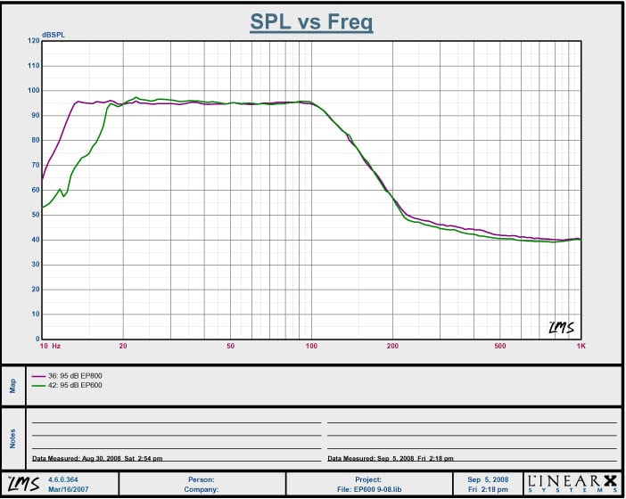 Ep600 vs EP800 Bass Extension Comparison SPL vs Frequency Graph of EP800 (1 meter, 4pi)