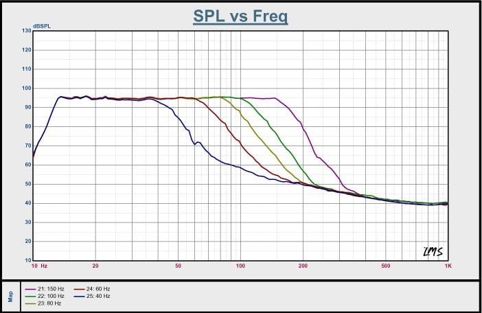Once the EP800 is playing at around 110 dB at 1 meter in 4pi space, the -3dB point moves up to 22Hz. Above those levels, we see additional compression at both frequency ends caused by the DSP purposely limiting the output to keep distortion low and thermal compression down to a minimum. In comparison, most subs that don’t employ a form of limiting will simply exponentially increase distortion output and mechanical noise when tasked to play at their limits. Instead, the EP800 will simply play lower to avoid such sonic nasties. Another advantage of the dual driver approach of the EP800 over the single driver ported EP600 is the former can play louder at certain frequencies with about ½ the distortion since each driver will move only ½ as much to do the same work.