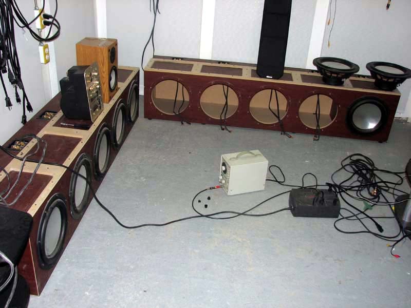 Now if this isn’t a cool way to reconfigure an EP500 (left pic), I don’t know what is. You will notice the resistor bank loaded on each sidewall of the cabinet. This creates a test load capable of sinking up to 2000 watts into an 8, 4 or even 2 ohm load, a necessary evil for properly testing the very powerful A1400-8 multi channel power amplifier. They don’t just stop at a powerful resistive load. Axiom wired it up Back to the Future style to include reactive loading using a multitude of woofers starting with the 12” driver in the EP500 all the way to their adjacent subwoofer room loaded with more loudspeaker drivers (right pic). Reactive loading testing is imperative for amplifier stability testing and determining how well it will perform with real world test loads, particularly their A1400-8 amplifier.