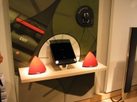 We got a chance to see and, to some extent, play with a number of different products from Bang & Olufsen while visiting the mock store at The Farm. We toyed with production units like the quart milk box shaped BeoSound 3 - a portable radio/SD card reader, the desk-sized BeoLab 4 speakers, and even a pyramid-shaped speaker designed for nearfield listening with interchangeable exterior grills of different colors to fit any mood. The Serene cellphone was interesting - a cool if slightly pointy portable phone with a camera in the hinge. I loved the the circular keypad and the way it automatically opened with just a touch, though the fact that you have to talk into the screen and listen to the keypad seemed a little counterintuitive to me. The phone retails for around $1500 (yikes) while the EarSet 2 retails for a "mere" $300 or so. The EarSet 2 is a Bluetooth headset which claims up to 4 hours talk time and 100 hours of standby time. It looks kind of like something made by the Borg but it is light and seems to be fairly comfortable. You'll be reading more about the EarSet 2 in the future.