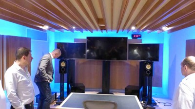 B&W had several demo rooms at their facilities to listen to and they made it a point for us to check out their high performance CWM8.5 ($2,800/pair) In-Wall speakers. The CWM8.5's feature a 7" mid-bass Kevlar driver and a 1" aluminum carbon braced tweeter with Nautilus tube and anti-resonance chamber. They are designed for new installs and come with back boxes for a controlled acoustical enclosure and isolation. We listened to a track called "You Won't Forget Me" by Shirley Horn. The cymbal rides were very open and airy producing an excellent soundstage for an in-wall. Bass was a little lean but very clean. If I were installing a pair of these speakers, I'd definitely add an in-wall sub to supplement the bass response.