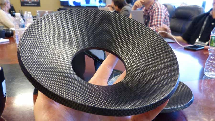 Driver samples were passed around the table, as were assembly parts with explanations on what and why things were done this way. I was particularly enamored with the 10" bass driver, especially noting how thick, yet light and rigid the cone material was. The cast basket employed a neodymium motor structure to create the necessary magnetic force without being impractically large and heavy. The turbine enclosure (weighs a whopping 40lbs), constructed of aluminum, was quite an impressive piece of engineering. It is used to house the 5" midrange starting on the 803 D3 model, while the 800 D3 model utilizes a slightly wider version of the enclosure to accommodate the 6" midrange. It was quite challenging hoisting it up on my shoulder for this photo opportunity. Kids, don't try this at home.