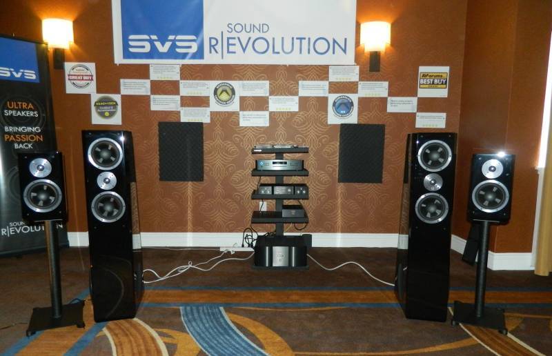 SVS' 2 channel rig featuring both their Ultra towers and bookshelves, driven by Mark Levinson amplification.