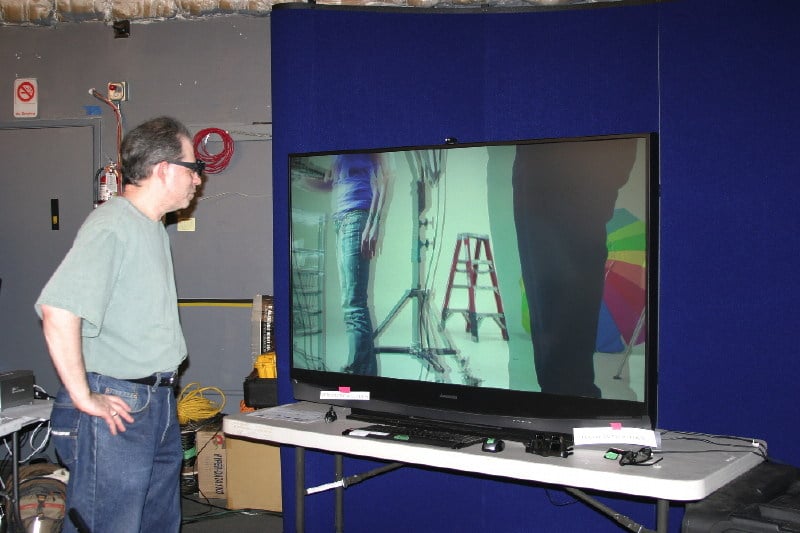 Oh sure I can guess that the guys and girls wearing the jumpsuits are involved in motion-capture, and seeing double images on Samsung rear-projection DLP’s indicates that 3D is being shot and delivered for viewing (and that I should pick up a pair of those 3D glasses that are lying around). I get that the 3D Stereo Rig designed to hold two cameras for stereoscopic photography, is modular in design. I get that those emitters on top of the Samsungs are there to sync with the LCD glasses for 3D viewing, but overall this isn’t like some trade show with booths and a well defined path to travel between them; think more of a free for all, with computers and other equipment scattered around this very, very, very large room.