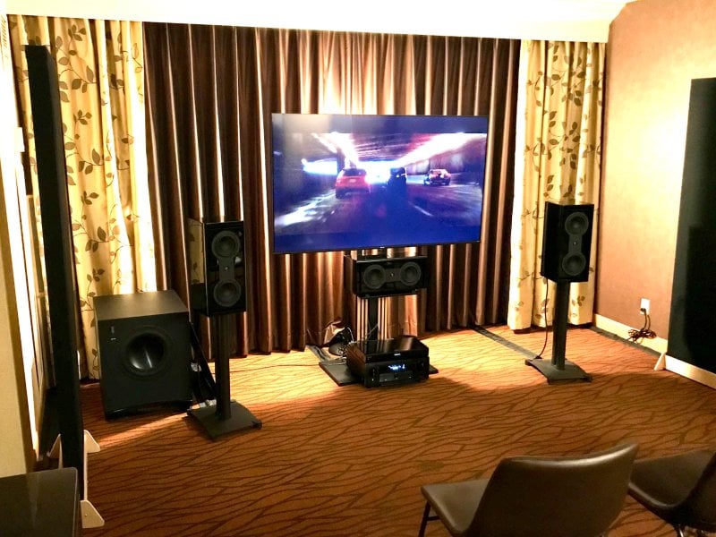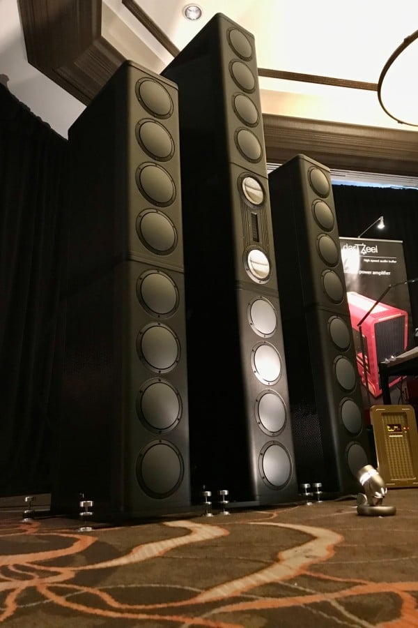 Moving on from one of the more affordable systems at the show, we come to what was probably the most expensive system I heard all weekend. The American speaker company Evolution Acoustics always makes great sound when paired with the beautiful, red and gold electronics from Switzerland’s darTZeel. It’s been a while, but the last few times I saw these two companies at an audio show, the speakers on demo were the small and sleek Evolution Acoustics MicroOne stand-mounts ($5,000/pair). When powered by pricey darTZeel amplification (which looks exactly like something Tony Stark might use), those little speakers sound incredible. But I don’t know how they’d sound with more affordable gear, and that uncertainty was just barely enough to enable me to control myself when I learned that the MicroOne was being offered for $1999/pair, including stands and shipping, if purchased during T.H.E. Show. My wallet managed to escape unscathed, but I’m still not sure I made the right choice. I have heard many impressive demos of the MicroOne in years past, but it was only on passive display this time around. The demonstration system at T.H.E. show involved something very different, and MUCH bigger, from Evolution Acoustics.