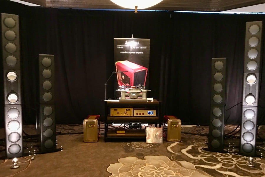 The enormous demonstration system, sponsored by the LA-based high-end audio store The Audio Association, included three SYSTEM towers per side. The center tower on each side was composed of two SYSTEM BASS modules sandwiching a SYSTEM CORE module in a D’Appolito configuration. Flanking the center tower were two bass towers, each made of two SYSTEM AMP modules stacked together. That means each side had one tweeter, two midrange drivers, and no fewer than 24 woofers, for a total cost of $360,000! And that’s just for the speakers. Electronics included the darTZeel LHC-208MKII integrated amplifier ($25,500 — being used as a network player and DAC), the NHB-18NS MKII Preamp ($61,000), and the NHB-468 monoblock power amps ($245,000/pair). Although I listened to digital audio, there was also an analog rig, which included a Wave Kinetics NVS Reference direct drive turntable ($45,000), a Durand Tosca LE tonearm ($31,400), a Durand Phono Cable Level 3 ($4500), and a phono cartridge from darTZeel’s new Founder Series (price not given). I couldn’t escape Holly Cole at the show, but I didn’t mind hearing “Train Song,” with its persistent percussion patterns, on this ridiculous system. The upright bass was reproduced with incredible power and effortless depth, though it sounded a bit exaggerated down in the gut-rumbling region. Santana’s “Oye Como Va” sounded huge, vibrant, and like it was recorded yesterday. There are certainly worse ways to spend a million bucks than on this massive, over-the-top audio system.