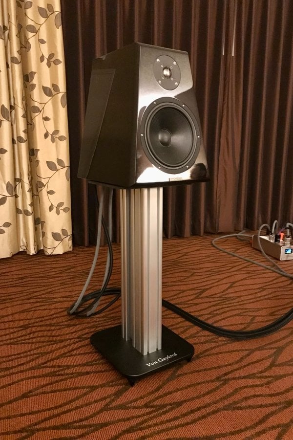 I had seen Von Gaylord Audio in passing at a few other shows over the years, but didn’t really know what to expect when Aaron and I entered the room and saw some attractive tube amps powering a pair of stand-mounted speakers with an interesting trapezoidal silhouette and a mahogany high-gloss finish. I later learned that the speakers were Von Gaylord’s VG-18 ($6,900/pair), and that the electronics included the company’s Sweet-preamp/DA ($4,500) being used as a DAC, the Harmony preamp ($5,000), and the Nirvana Signature Mono Amps ($10,500/pair) running Tungsol KT120 tubes. The system delivered crystalline clarity on “The Tennessee Waltz” by the Holly Cole Trio, with the harmonica in particular sounding arrestingly present. At first I thought the system might have been exaggerating the sibilance in a way that I found disagreeable, but after hearing that same track on two other systems, I am convinced that the sibilance issues are present on the recording. Just goes to show the dangers of drawing conclusions based on unfamiliar recordings! (As a side note, I have always been a fan of “The Tennessee Waltz” in general, but don’t particularly care for the Holly Cole version. Check out the album Vol. II by Watkins Family Hour to hear a version that’s more to my liking.)