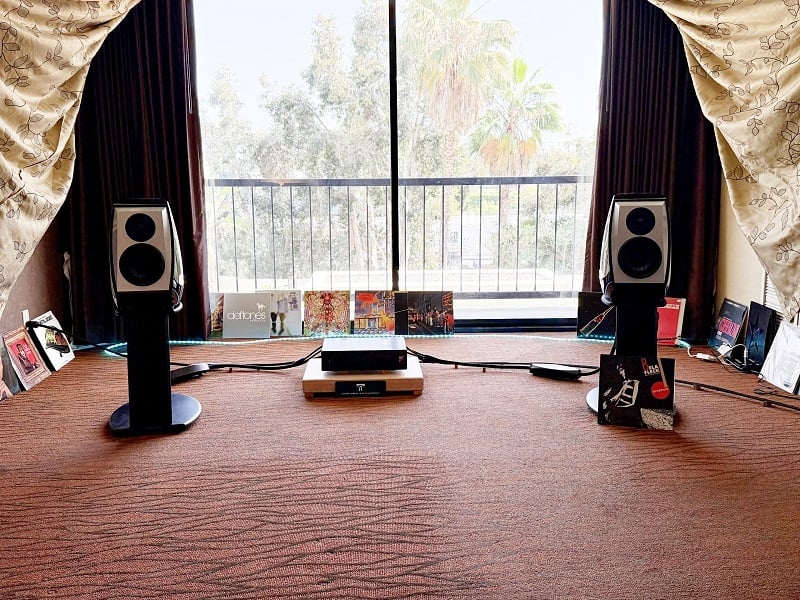 I was excited to hear the Diptyque Audio Reference MK II planar magnetic speakers ($60K/pair), which had been described to me as “Magnepans on steroids.” In this room sponsored by The Audio Association, the setup included the Audia Flight FLS 1 preamp ($10K) and a pair of FLS 8 monoblock amplifiers ($12K each), with the popular Grimm MU2 streamer/DAC ($17,500) as the source. Cables were provided by Viablue, with networking gear from Dejitter it. The attractive wood equipment rack and amp stands were from Massif Audio Design. The room setup was less than ideal — curtains were used as sidewalls to close off the listening area, but the room itself was large and asymmetrical. Nevertheless, the system got off to a good start with “Six Blade Knife” by Dire Straits. Immediately, the boxless sound of a panel speaker made itself known, but with great micro and macro dynamics, the latter of which is not typical of a panel design. The bass was quick and precise but not subwoofer deep. On a cover of “Wicked Game” by the Manchester-based singer-songwriter Lusaint, the ethereal vocal track had see-through clarity. The system really started to cook on a track called “Anything & Everything” by Vini Vici & Pixel, which featured electronic synths building in volume over a throbbing and ticking soundscape. When the bass dropped, I was completely shocked. Similar-sized Magnepans could never pump out bass with this kind of visceral slam. It might not have been reaching infrasonic depths, but I don’t think most people would feel anything missing or even consider adding a sub. (Many subwoofers can’t produce bass this clean and laser-fast, so if you do add a sub to panel speakers, make sure it’s a good one.)