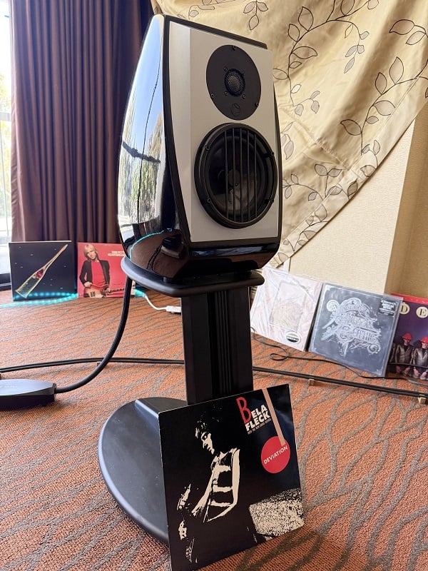 I always applaud the bold choice to play banjo music at an audio show, so I was pleased when Ayre’s Jake Forsyth suggested Béla Fleck’s 1984 album Deviation, which we listened to on vinyl. On the tracks “Nuns for Nixon” and “Moontides,” the soundstage exceeded far beyond the outer edges of the speakers themselves. In my notes, I described the sound as electric: energized and totally holographic. On “Ambrose,” which is probably the funkiest banjo track I’ve ever heard, the highs sounded a bit tipped-up, but that made for an exciting listen. There was astonishing output from that small mid-woofer, which sounded blazing-fast. The electric bass and drums felt full-scale, yet they could start and stop on a dime. Actually, they sounded as if they could stop and start on a single atom of nickel on the surface of a dime.