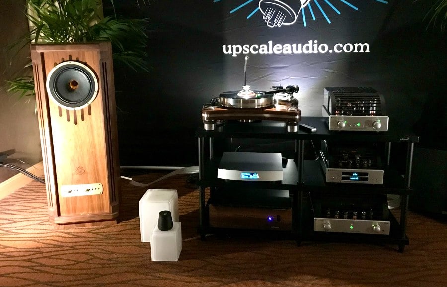 Next door, I did have a chance to enjoy the stately Tannoy Kensington loudspeakers ($19,790/pair) in a system that included the PrimaLuna EVO 300 Hybrid Tube Integrated Amp ($7,295), the PrimaLuna EVO 100 Tube Phonostage ($3,695), the PrimaLuna EVO 100 Tube DAC ($3,395), the Lumin U2 Digital Transport ($5,000) and a VPI Signature 21 turntable ($10,250) fitted with a Soundsmith Hyperion ES MKII Moving Iron Cartridge ($7,999). A REL S/812 subwoofer ($3,299) added low-end extension and heft. Power conditioning was provided by an AudioQuest Niagara 5000 ($5,900), and all cabling was by Cardas. When Upscale Audio’s Kat Ourlian played Sade’s “Hang On to Your Love,” I was immediately struck by the super-tight and punchy kick drum. (I swear, those REL subs can do magic.) In my experience, Tannoy speakers can have a tendency to sound strident up top if not mated with the right electronics, but here the sound was effortlessly smooth while still being engaging and giving a sense of high resolution. A handsome and sonically successful pairing, if you ask me.