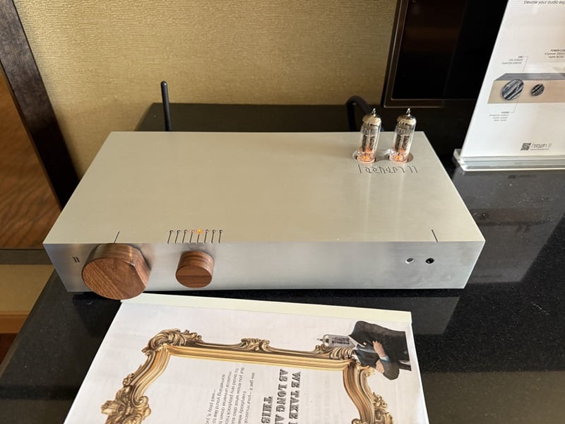 This system featured the new, modular Heaven 11 Billie Amp MK3 integrated amp (about $3K) driving the stout MC Audiotech TL-12 Loudspeaker ($30,000/pair), which features wideband line-source drivers coupled to a 12-inch transmission line woofer. This full-range speaker operates as a dipole from 300Hz and up. The very attractive Billie Amp MK3 is a modular design — you can choose a fully-loaded version with one of two DAC options and a phono stage, or a stripped-down version with only line-level analog inputs. You can also choose between the ICEpower 200AS2 and Hypex NC252 “Power Core” options. Further customization options include two different headphone amps, a variety of tubes for the preamp section, and even different knob materials. The amp at the show had the upgraded dual-chip DAC, which uses a pair of ESS Sabre ES9039 DAC chips. I believe it featured the Hypex Power Core, but don’t hold me to that.