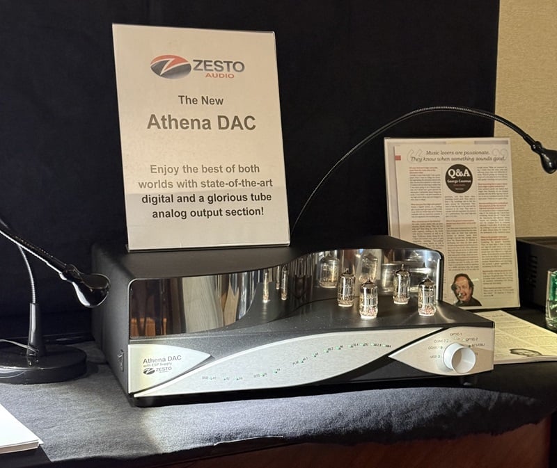 Why bury the lede? Of everything I heard at T.H.E. Show, this system is the one I’d want to take home. It was easily in the top three for overall sound quality, despite being nowhere near the top in price. (That doesn’t mean it was cheap, however.) The Zesto Audio room was showing off the California-based company’s new Athena tube DAC ($15,000). It reportedly decodes files up to 32-bit/384kHz and DSD256, and includes AES, USB, I²S, optical, and coaxial inputs, plus a ground-lift switch, and both balanced and single-ended outputs. At its core is a state-of-the-art ROHM chip, which feeds a tube analog output circuit. Zesto’s George Counnas explained that because the Athena’s tube circuits don’t need filtering, this DAC can eschew the digital filters required by solid-state DACs. All filtering is done through the tube output circuitry with minimal phase shift, creating a better stereo image and black levels, according to Zesto. The superb YG Acoustics Summit loudspeakers ($29K/pair) were being driven by Zesto’s Eros 500 Select Monoblocks ($35K/pair), which dish out 250 watts of Class A power. The preamp was a Zesto Leto Ultra II ($11,900), and the pricey cabling was provided by Cardas. Isolation and room treatment products were provided by Stillpoints.
